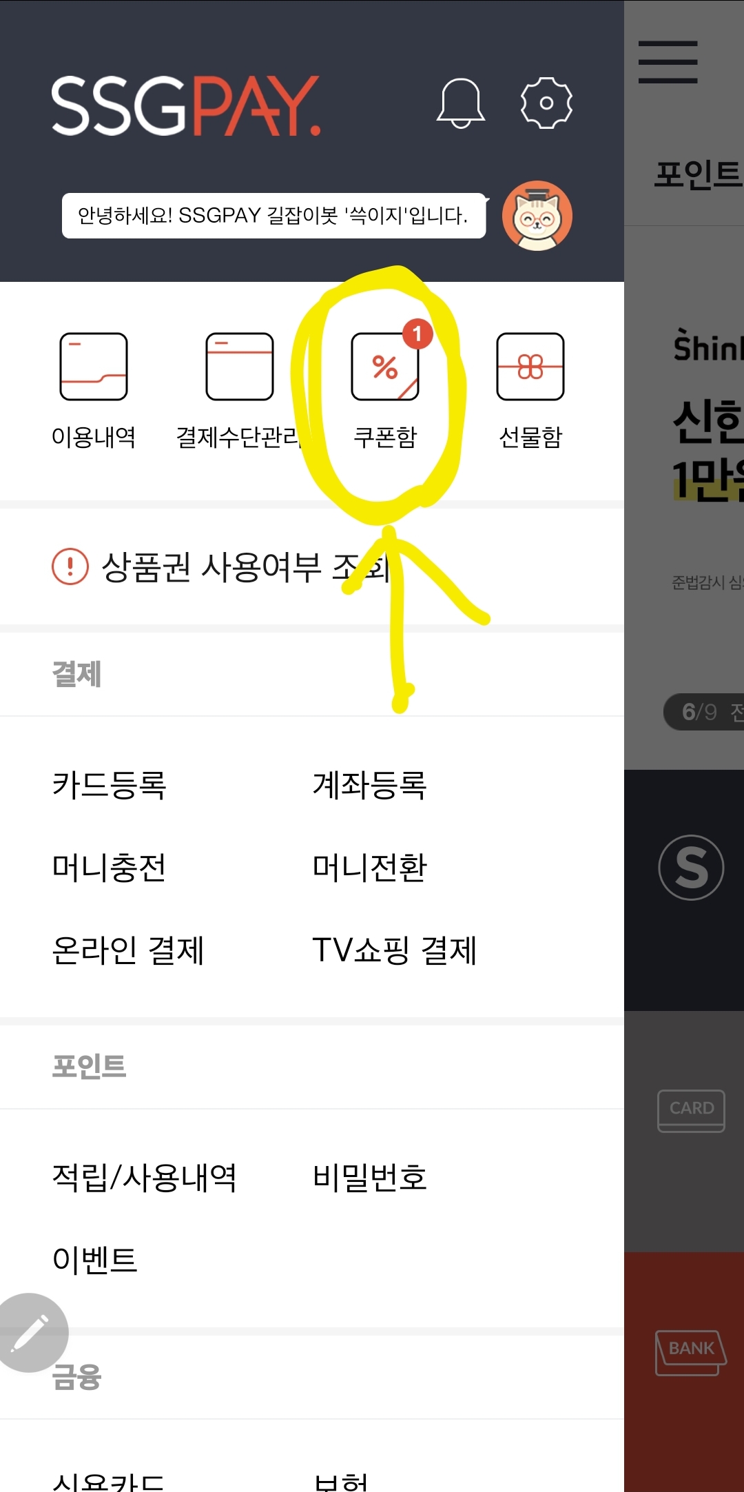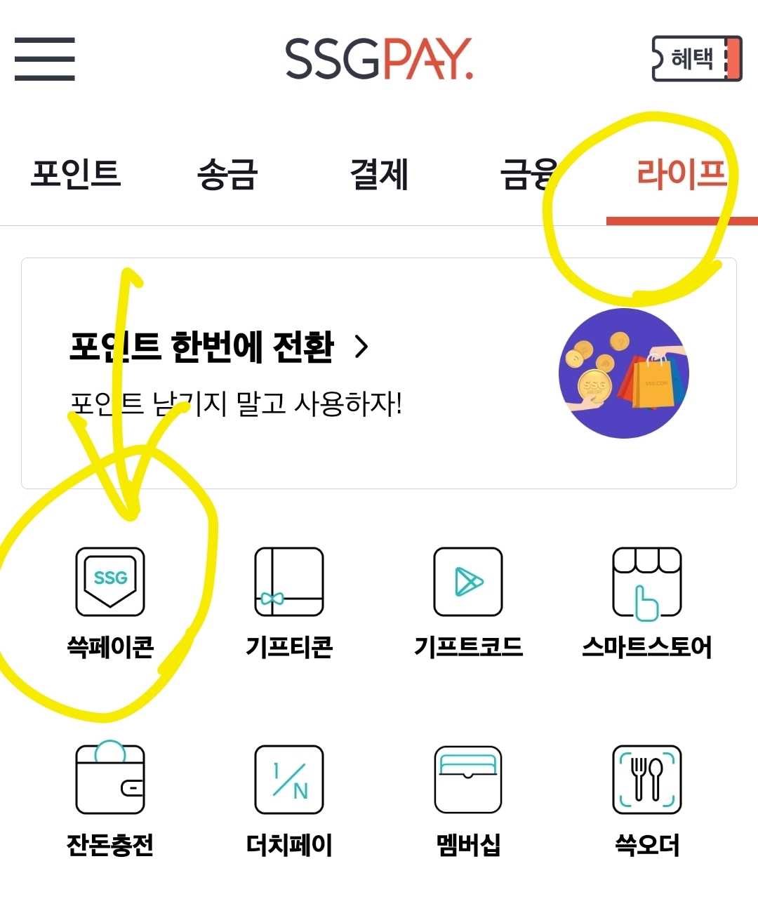라이프 메뉴 중 쓱페이콘이 있습니다. 쓱페이콘을 클릭해 주세요.