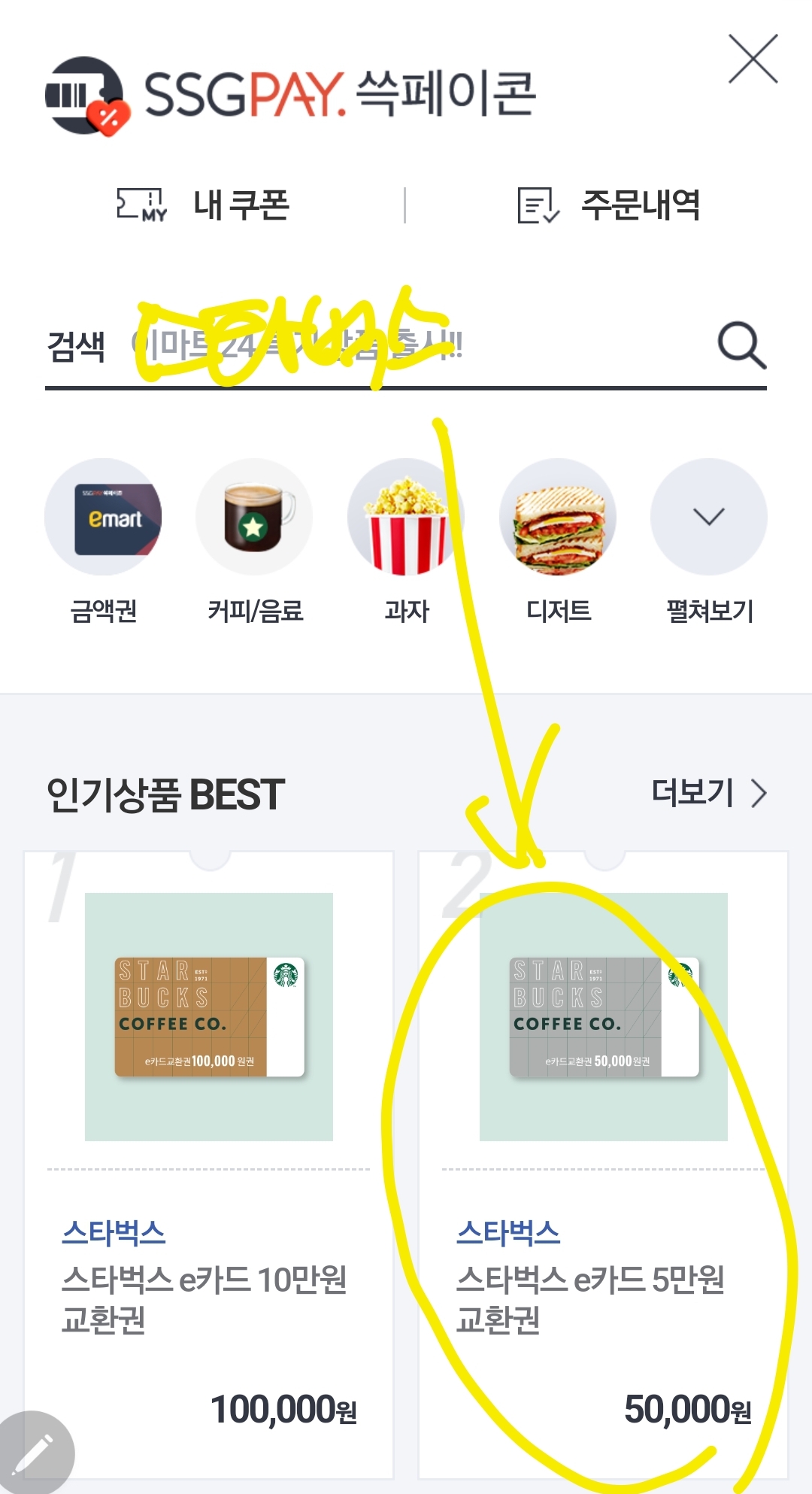 쓱머니로 스타벅스 기프트카트 구매하는 방법