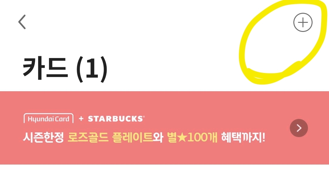 스타벅스 앱 실행 > PAY 클릭 > 오른쪽 상단 메뉴 클릭 > + 십자가를 클릭해 등록합니다.